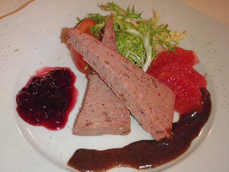 PaÅ¡tika z kachních jater, Å¡vestková omáčka, brusinky, filety z pomerenče a grapefruitu – 120,- Kč