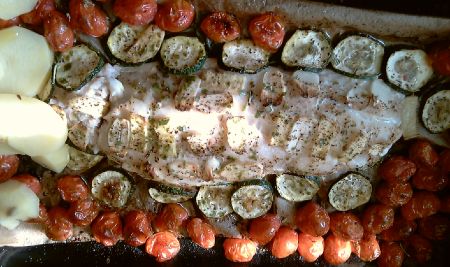 OsolÃte ji moÅ™skou solÃ, opepÅ™Ãte, naskládáte na nà plátky Äesneku (nejlépe jiného než ÄÃnského, ten nenà kvalitnà a nemá výraznÄ›jšà aroma), zázvoru, po stranách obložÃte nakrájenou cuketou a celé to obsypete sherry rajÄaty. Nakonec zaprášÃte bazalkou a celé to zalijete olivovým olejem, ten pÅ™elijte i pÅ™es rajÄata a cuketu!